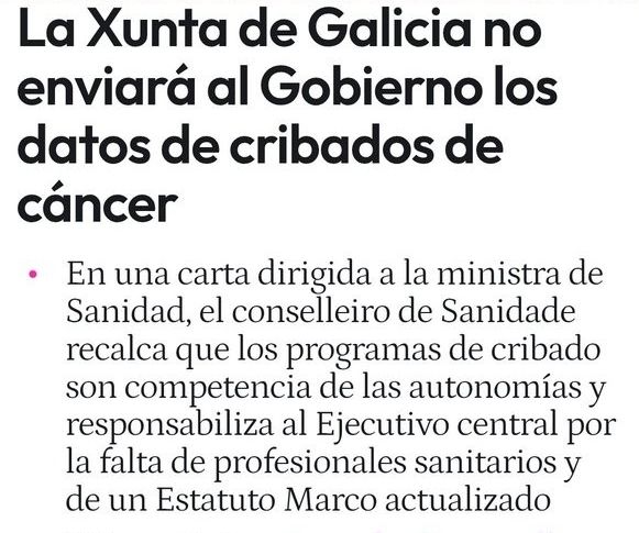 La Xunta de Galicia se suma a la lista de CCAA del PP que se niegan a dar la información de los cribados de cáncer al Gobierno. Esto es muy grave. Esto va a ser una negligencia tras otra que nos va a costar muchas vidas!!!!!
