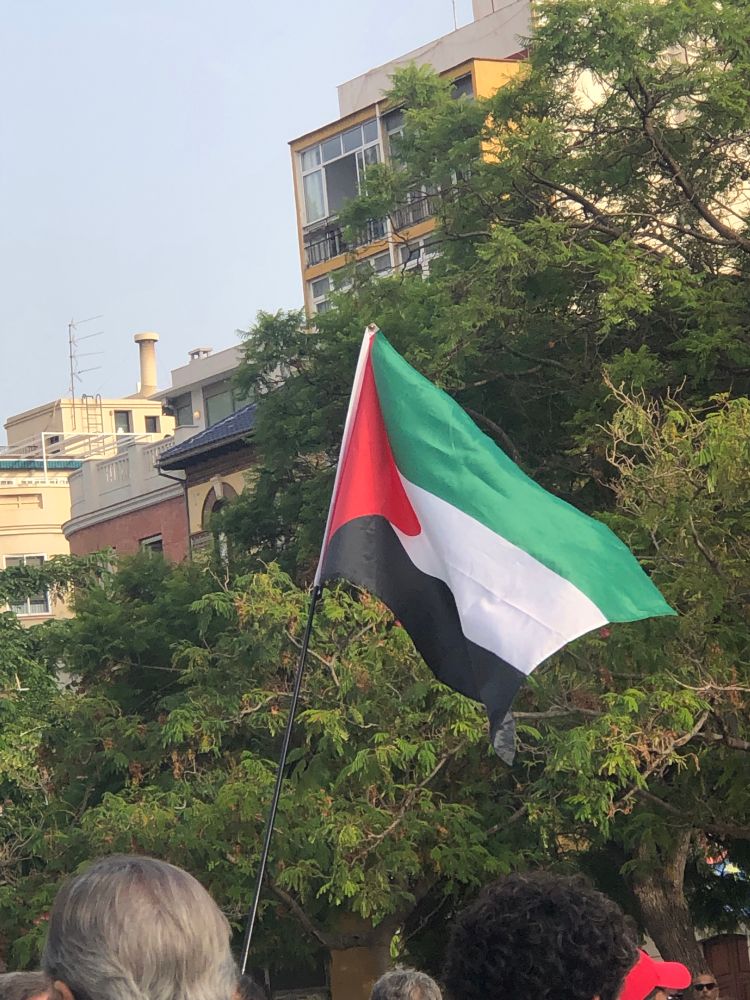 Torre Mónica y la playa de La Misericordia y la bandera palestina ondeando ayer en la Plaza de la Merced.