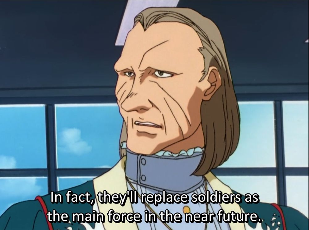#cha0sWing OZ and Romefeller begin using mobile dolls as the primary military force, with humans issuing orders behind the front line. The Gundam professors recognize that this turns warfare into a game, as the more automated a task is, the less responsibility a human feels for performing an action