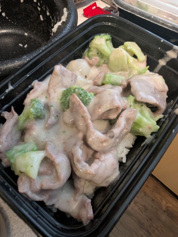 work lunch for the week, beef stroganoff with broccoli and onions over rice