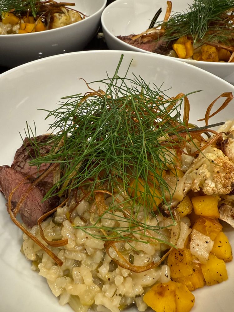 Fennel risotto with roasted pumpkin, roasted cauliflower, seared hanger steak and crispy leeks, and, cardamom panna cotta topped with black and red raspberries. It’s what was for dinner last night 🍽️🍜