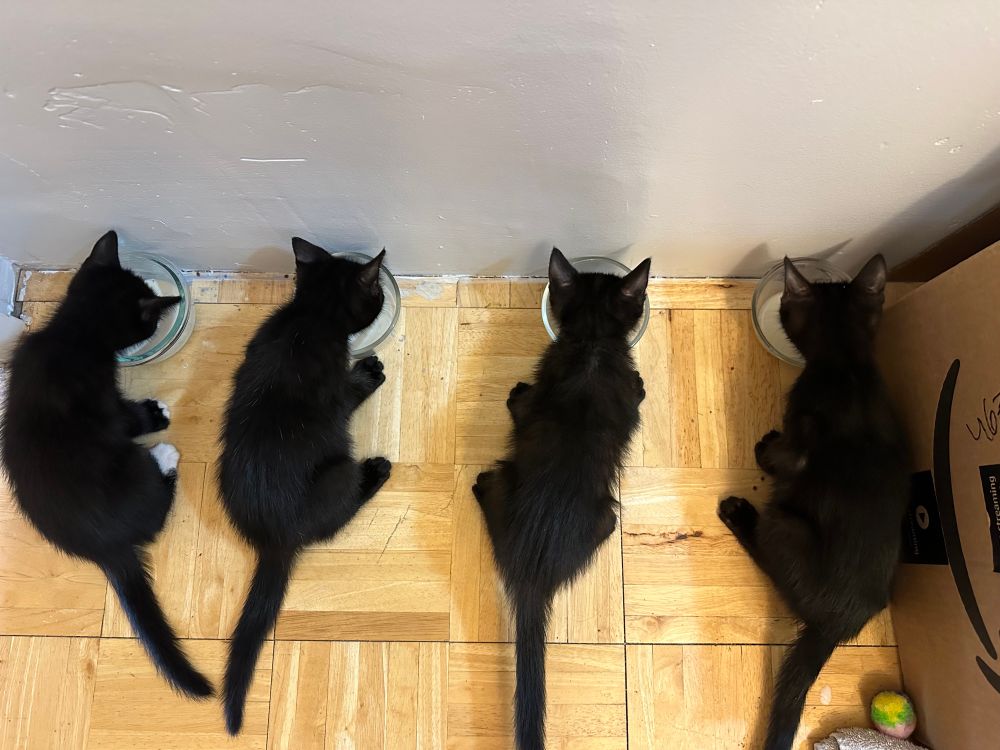 Several weeks ago, some evil person left a very tall box in the alley, in direct sunlight. Inside were 4 tiny kittens. I’ve been fostering them ever since.