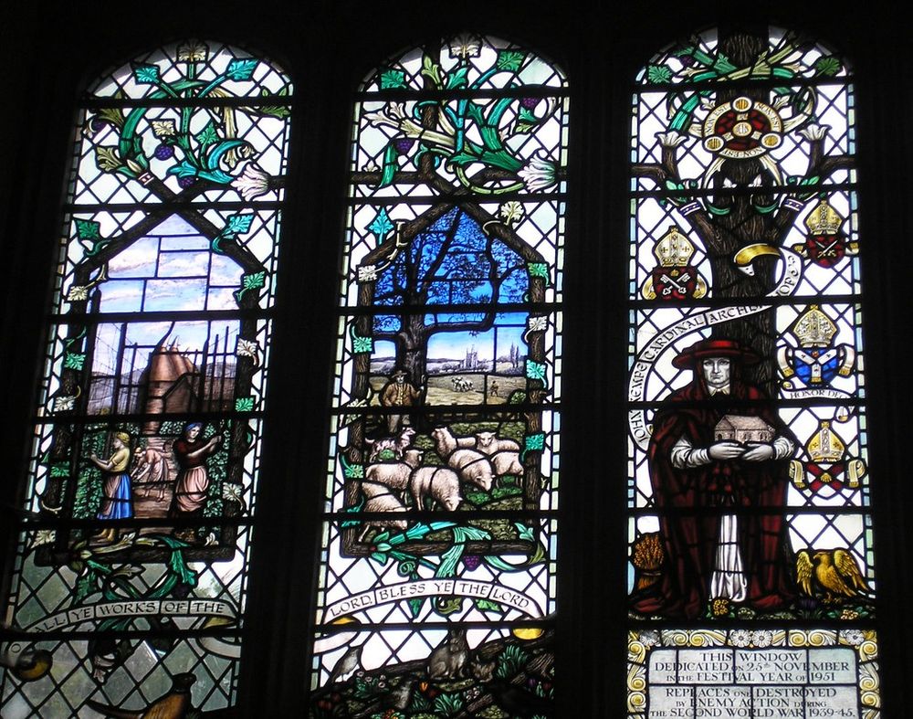 Stained glass windows in the Church of St Gregory and St Martin, Wye, Kent - depicting Kentish agricultural scenes (hops, apples, sheep etc) and Cardinal John Kempe, Archbishop of Canterbury (died 1454) who came from Wye. Windows installed 1951 to replace WW2 bomb-damaged windows #LocalHistory #Kent