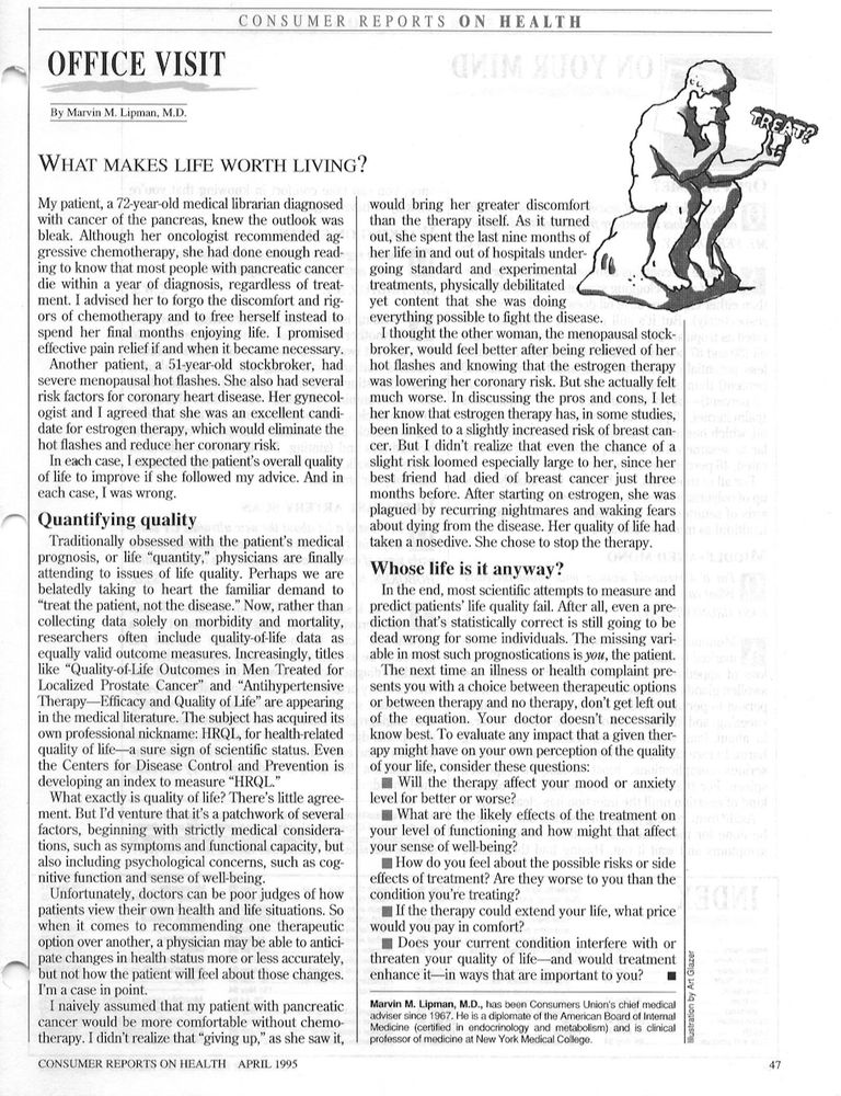 Going back through my old Consumer Reports files and I stumbled upon this classic - extremely valuable and timeless -Office Visit column by my dear friend and mentor and CR's chief medical adviser from 1967 to 2018, Marvin M. Lipman, MD.