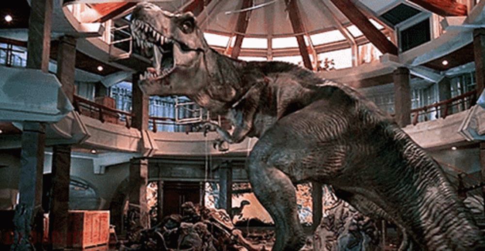 ALT: a large t-rex statue is standing in a building with its mouth open