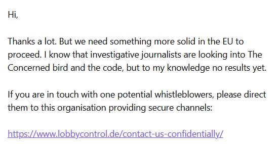 @theconcernedbird.bsky.social - I emailed @alexandrageese.bsky.social of EU parliament and she suggested any whistleblower write to their secure channel linked is here www.lobbycontrol.de/contact-us-c...