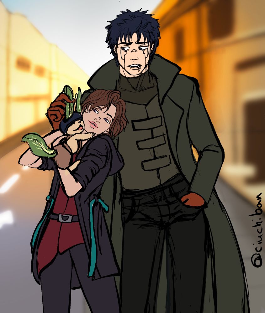 A drawing I made for artfight this time of instagram.com/puzzanips/ original character Aleksei with his little bunny Butterhead and my Oc Vera #artfight #bunny #oc #aleksei #vera #oc-interaction