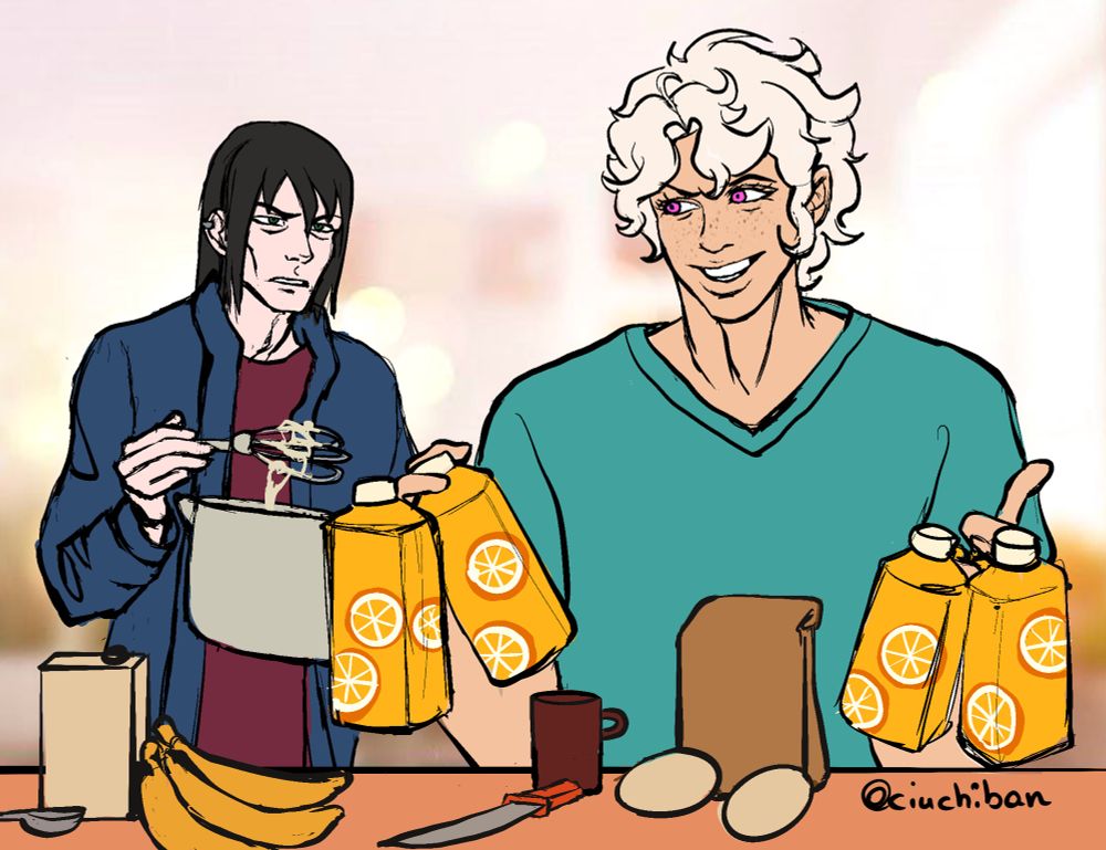 Another art-fight drawing I did with artfight.net/~Brenical_ly her character Ukanoa and my Oc Draven: Ukanoa: You said to get orange juice and if they have eggs, get 4. Guess what! They had eggs!