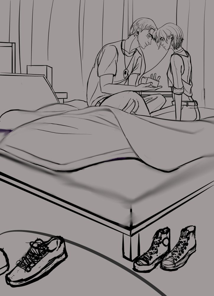 Process of the drawing I made during artfight of the handsome Lehmagra, Oc belonging to the amazing @halopromise.bsky.social, and my Oc Sane hanging out. #lehmagra #halopromise #artfight #sane #oc