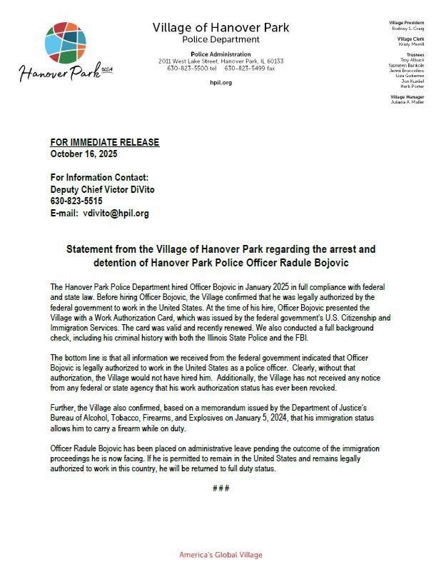 Here’s a statement by the Hanover Park PD on the officer that ICE claims is in the country illegally (he’s not) and that Hanover Park illegally hired (they didn’t).