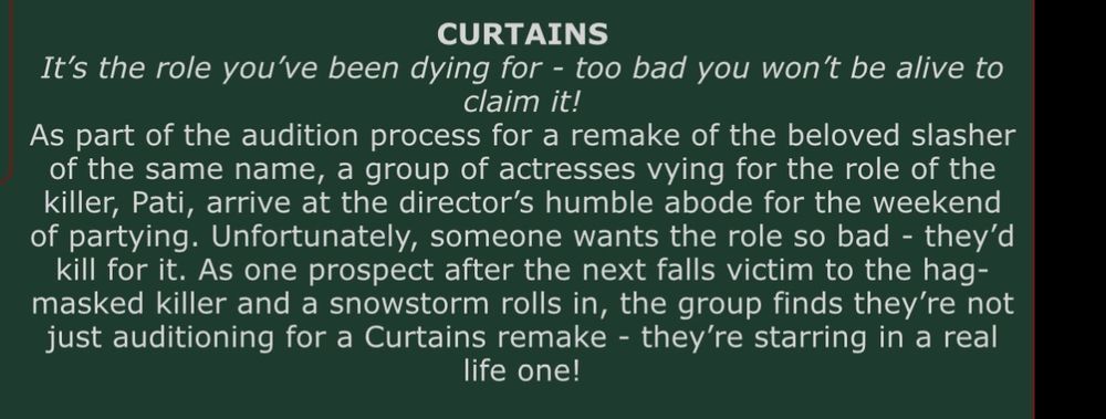 “A year after their sister’s untimely suicide, the sisters of Alpha Delta Pi find their all-night scavenger hunt crashed by disturbing clues about that night and a maniac in a bear costume.”