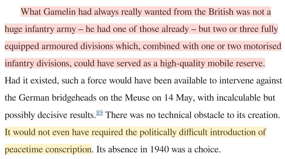 @alanallport.bsky.social Isn't a counterargument here that there would have been heavy political pressure for the BEF to be kept on the frontline, because using it as a reserve would inflame the suspicion that Britain was "fighting to the last Frenchman"?