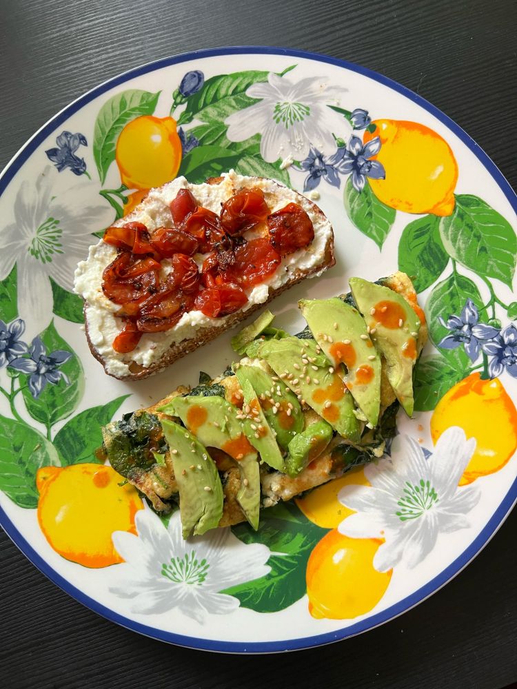 for breakfast, i made a ricotta tomato batard toast with a spinach, ricotta and avocado omelette. matcha latte not pictured 🍵