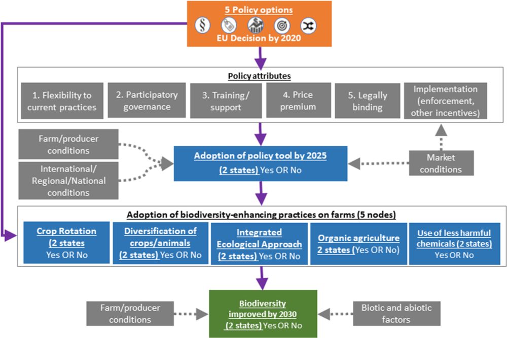 In this article, Biber-Freudenberger et al share their work comparing nature #conservationpolicies using a Bayesian belief network- modeling sequential effects on adoption, farming practices, and #biodiversity. Learn more at doi.org/10.1111/csp2...