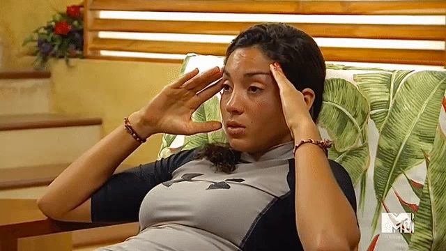 ALT: a woman is sitting on a couch with her hands on her head and a mtv logo behind her
