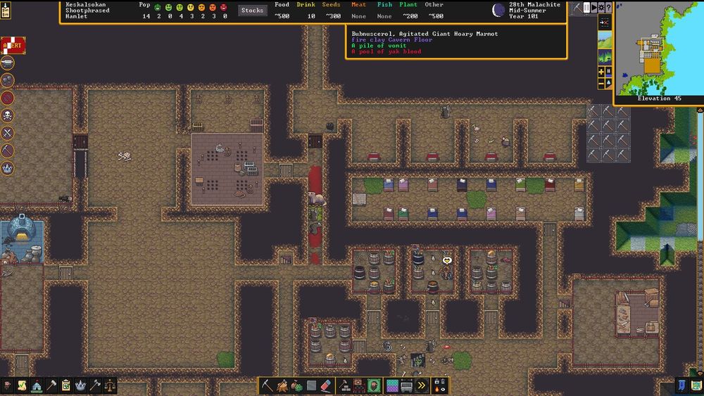 So I've finally tried Dwarf Fortress. Not long into year 2 my tunnels were attacked by Giant Hoary Marmots and this one in particular, "Scouredlenses," has murdered 3 adults, 2 children, and So Many Animals. I have no idea how to handle her so I'm going to bed.