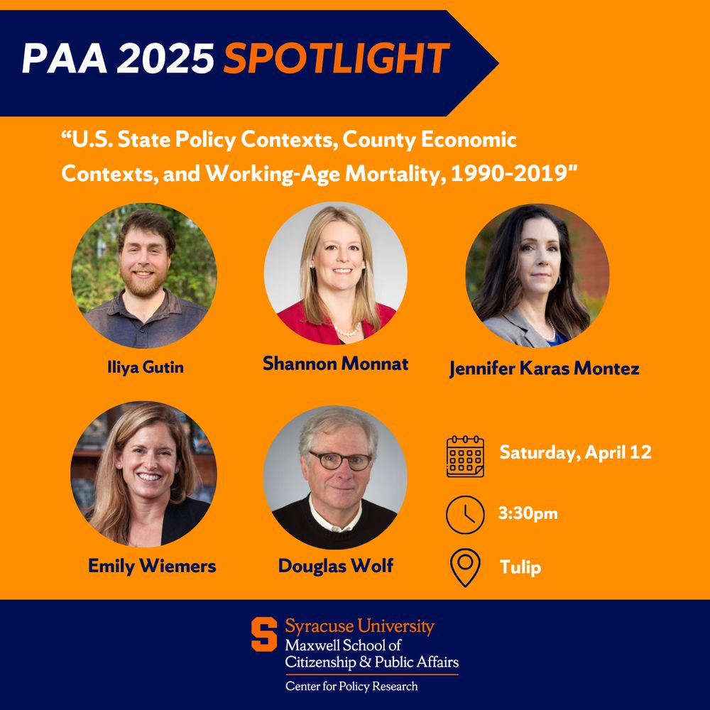 Today at #PAA2025! CPR Affiliates, Jennifer Karas Montez and Iliya Gutin will participate in the session, "Demographic Effects of Diverging State and Local Policies". @popassocamerica.bsky.social