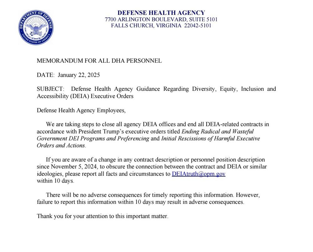 An actual memo distributed today demanding deia agencies be closed and anyone with redesigned jds to camouflage deia impact be reported. Those who withhold are being threatened. It would be a shame if the provided email was flooded instead with emails on what we think of this