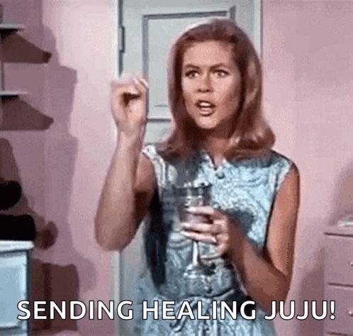 ALT: a woman is holding a glass of wine and sending healing juju !