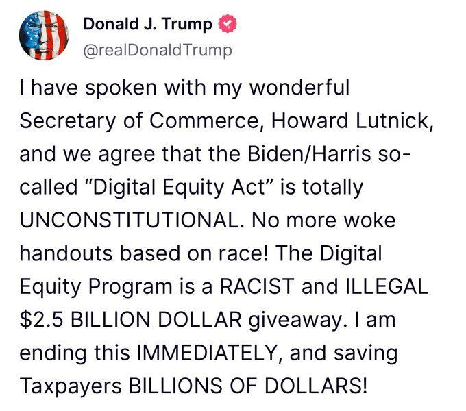 What a difference a day makes -- US Commerce Dept's BroadbandUSA "Digital Equity Act Programs" web page, yesterday and today. Trump Administration vanishes $2 billion set aside by Congress to help low-income Americans, veterans, rural residents, underconnected minority communities, etc. get on line.