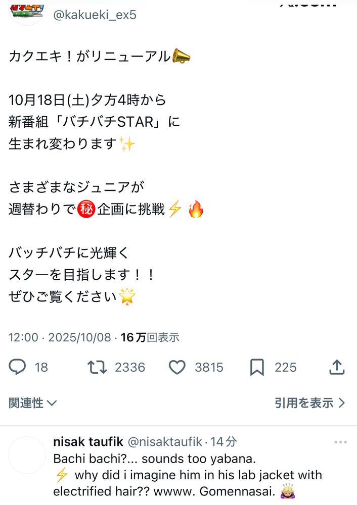 カクエキがバチバチになるっていうお知らせにbachi bachi ……sounds too yabana.っていうリプついててウケた。そうなの。