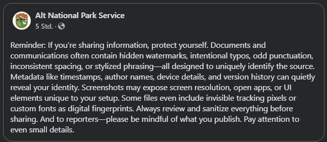 Im Jahr 2025: Ein eindringlicher Hinweis vom National Park Service (sic!) im Reich des imbezilen Mango-Gibbon. Mittlerweile liest sich dieser ganze übelst stinkende Bullshit wie ein Stephen-King-Roman, in dem es langsam auf den Showdown zuläuft ...