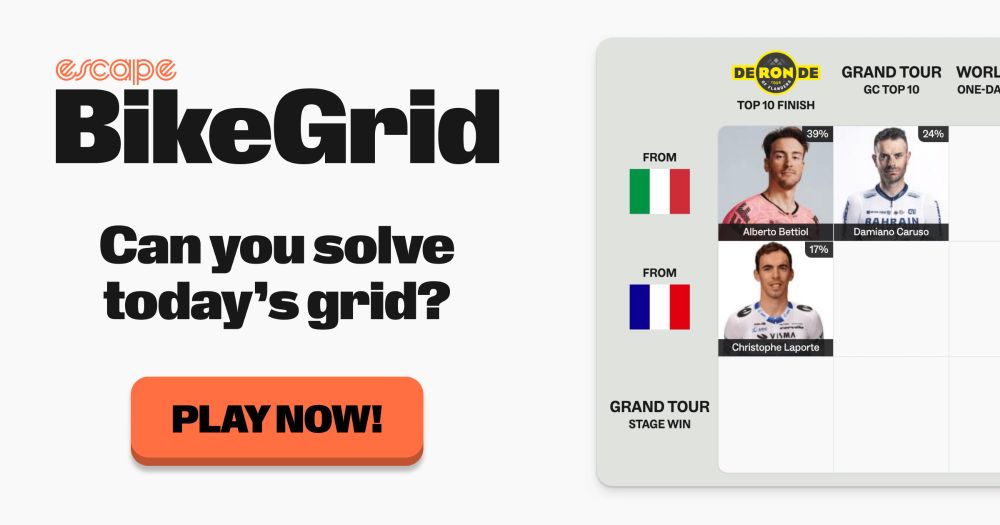 Play the popular new Cycling Trivia game - BikeGrid! Complete your grid using any current pro cyclists and earn rarity points for unique picks.