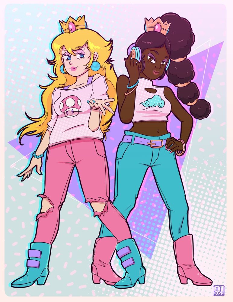 Princess Peach (aka Princess Toadstool) and my OC Princess Perske of the Briesie Kingdom in late 1980's early 90's Hip Hop fashion. (This was originally a redraw of Princess Toadstool from the Super Mario Super Show)