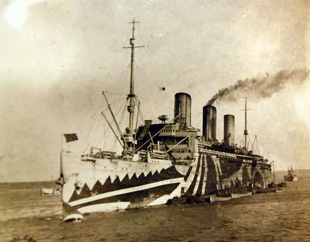 here she is in WWI as a troop transport sporting her dazzle camouflage, which was used to make judging distance, speed, and direction harder to determine and therefore harder for German U-Boats to sink.