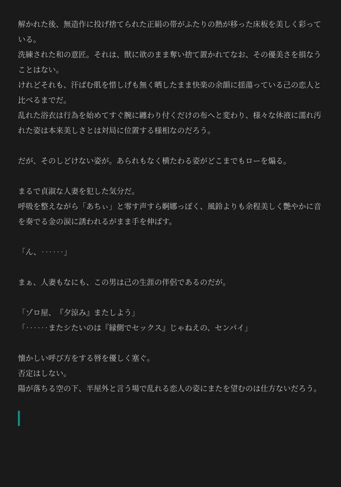 なんて会話をしながら浴衣で縁側セッ‥‥!する🐯⚔️になる筈でした‥‥‥縁側で「履かない、が正解だ」ってするする裾上げて上に乗ってくれる浴衣の⚔️くんがいる筈でした‥‥‥縁側で対面座iする🐯⚔️がいる筈で‥‥‥夏の間に書きあげたいものです(遅筆)
