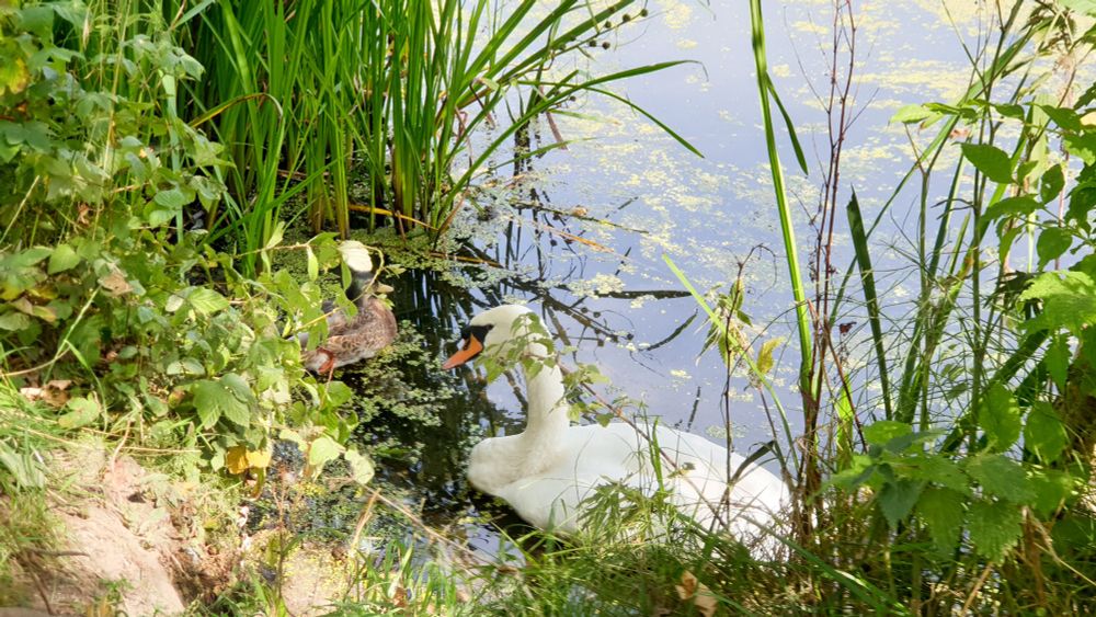 This swan, on Attenborough Nature reserve, barely moves. It seems to be dying? I think that it's the young one that we called Moriarty because in the winter it used to aggressively mug passers-by for food. The female mallard seemed to be staying with it. We were told to let nature take its course.