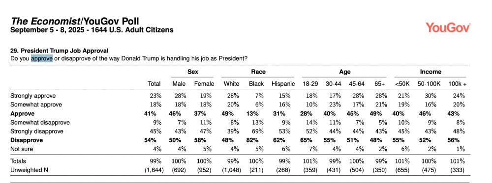 Trump's approval with 18-29 year-olds is -37 points, which is 24 points to the left of the overall sample. Many surveys have shown his sharpest declines among this group.