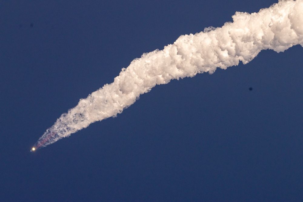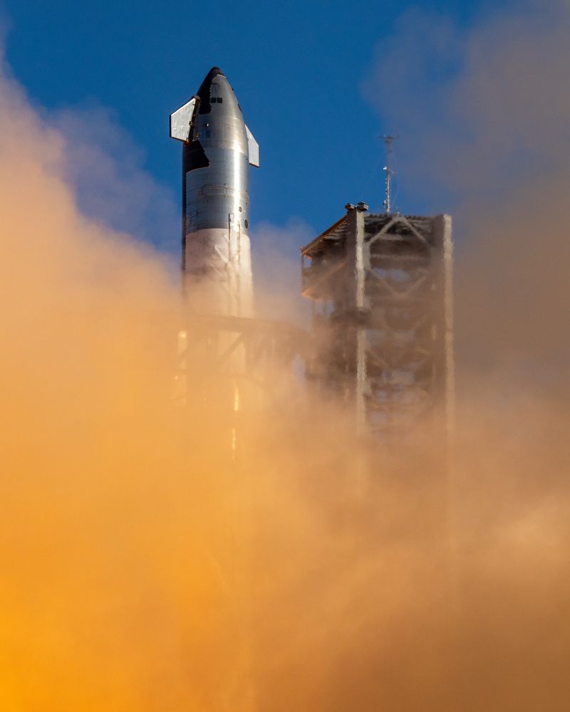 The painting of the first Starship flight which was a bit chaotic with flying debris and concretes around launch pad.