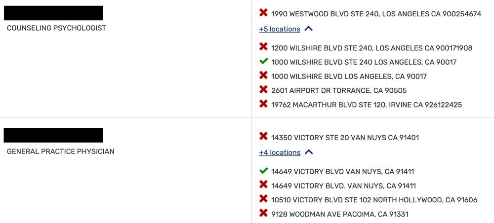 - duplicative addresses that either say a provider is covered by your plan (✅) or not (❌)