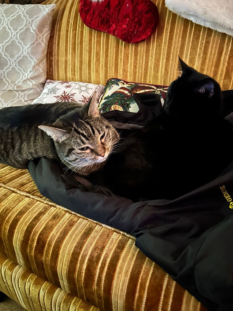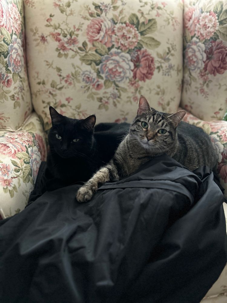 I have two Fiji the tabby and Roxi the one that disappears in the coat they decided to rest on🥰
