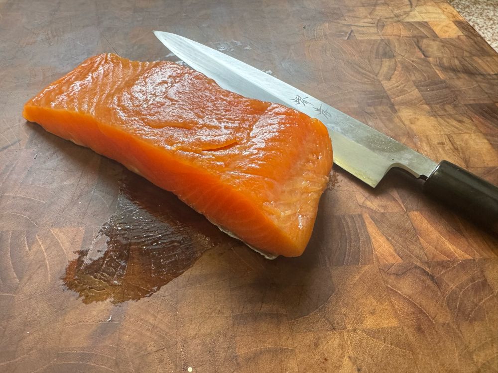 Last week our neighbor Ben dropped by some beautiful smoked salmon. It is perfect for our favorite breakfast, potato pancakes with shallot and dill cream. I also got to use my favorite sujihiki fish knife to slice the salmon. It has any an acute single edge and is made for left handed people.