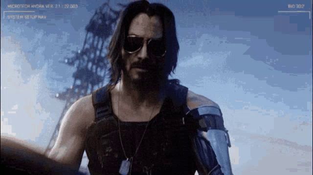 a man wearing sunglasses and a vest stands in front of a screen that says microtech hydra