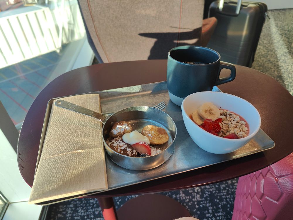 The sky lounge for my credit card is SO WORTH IT. Free actually good breakfast, they're playing ambient house music, they have abundant comfortable seating, and the restrooms are insane