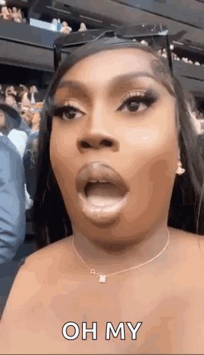 ALT: a woman is making a funny face while sitting in a stadium .