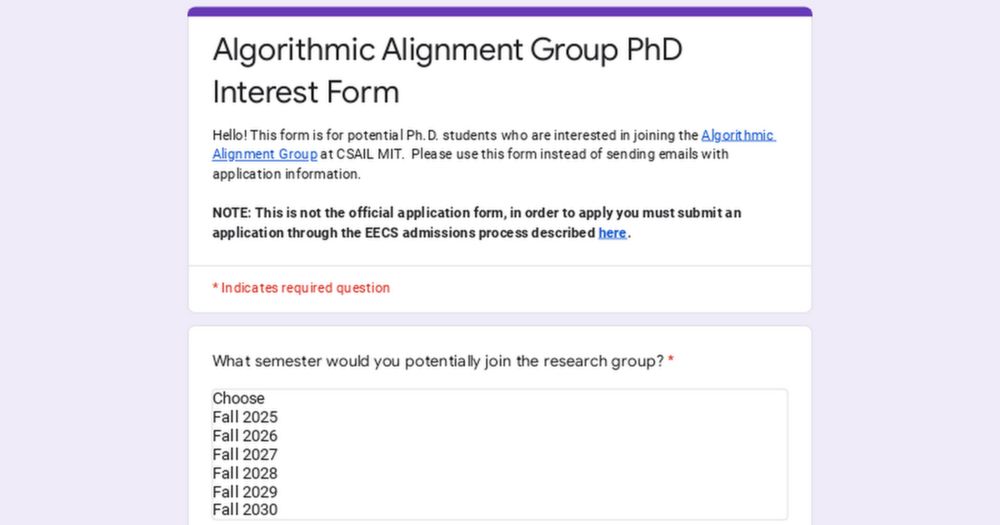 Hello! This form is for potential Ph.D. students who are interested in joining the Algorithmic Alignment Group at CSAIL MIT. Please use this form instead of sending emails with application informatio...