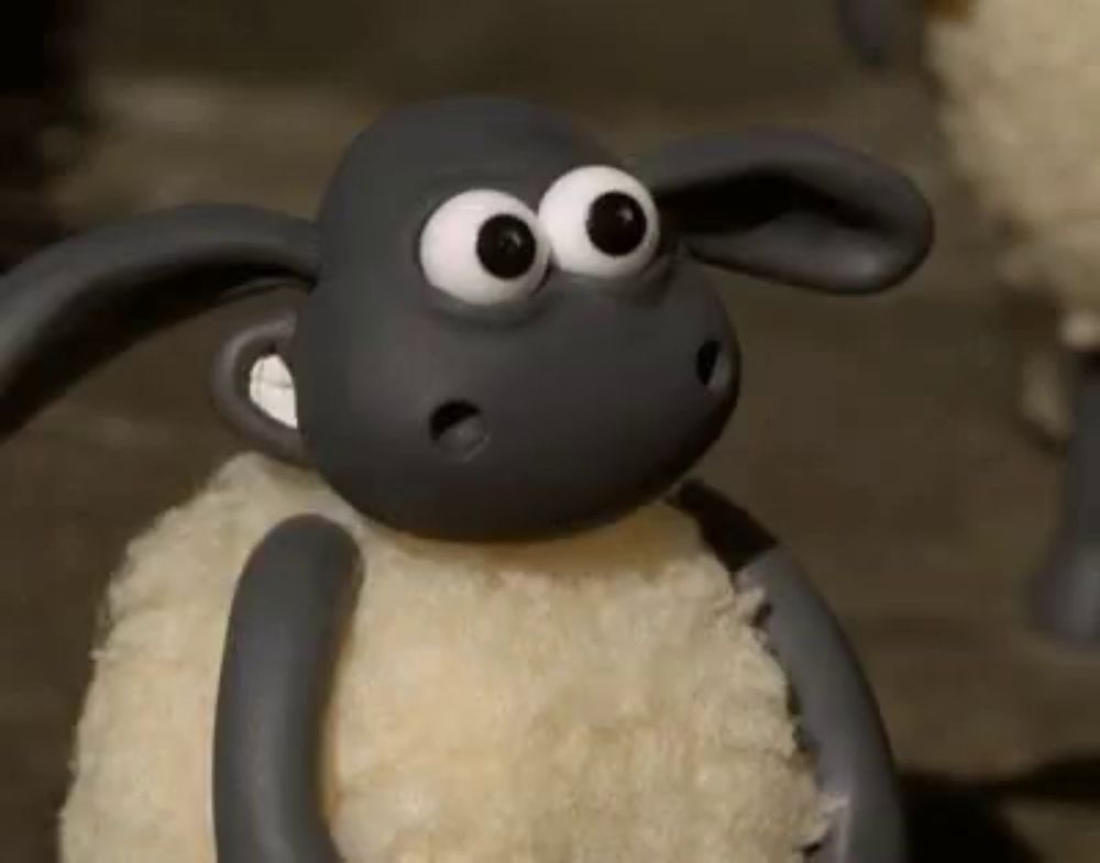 ALT: a close up of a cartoon sheep with big eyes standing on a sidewalk .