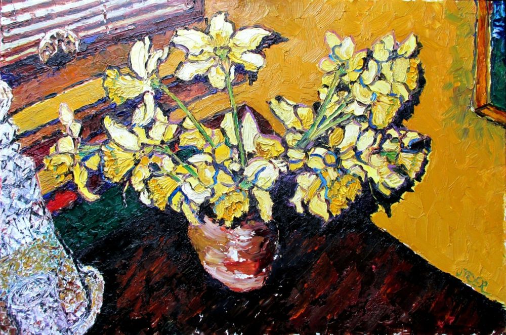 Wind turbines with figure, Oil, 42x57cm; Daffodils with glass decanter, Oil, 51x77cm.