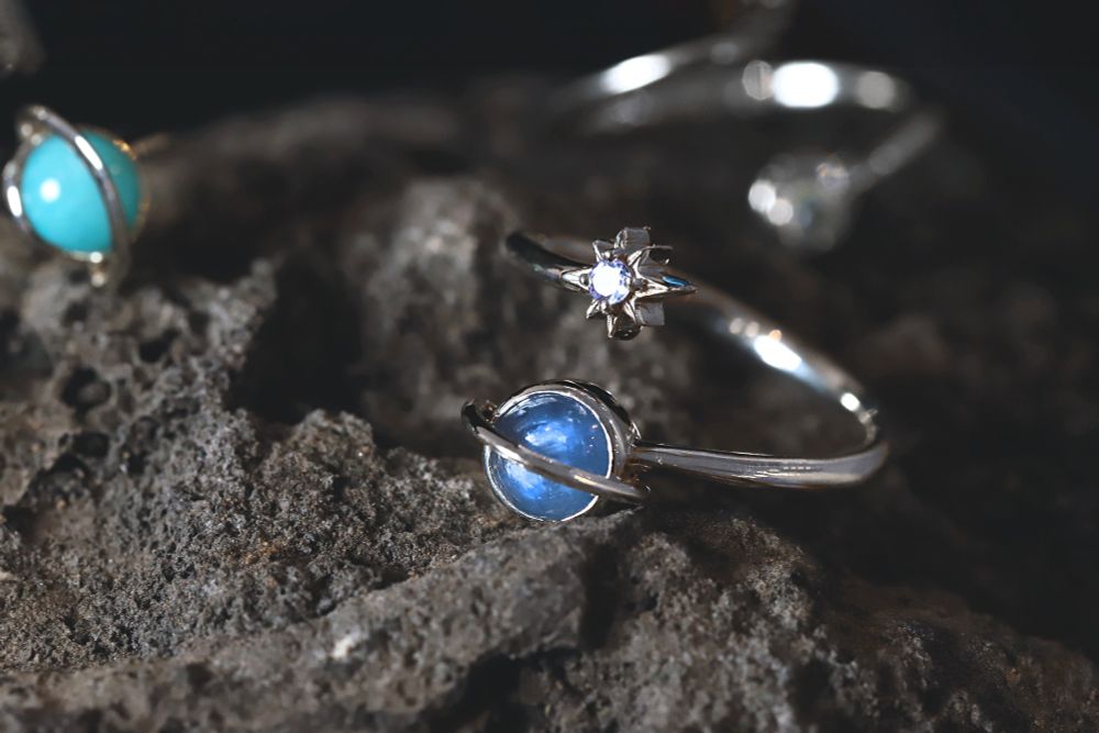 태양은 항성이기에 플레어와 광원 효과를 강조한 디자인과 더불어 일장석이라고 불리는 썬스톤을 세팅하였습니다. 원석 내포물은 마치 태양의 흑점과 닮아있습니다.
