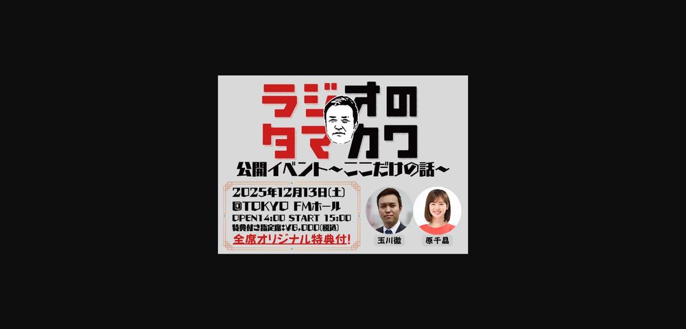 玉川徹の番組が初のイベントを開催!「『ラジオのタマカワ』公開イベント〜ここだけの話〜」 TOKYO FMで放送中の、玉川徹がパーソナリティをつとめる『ラジオのタマカワ』(毎週木曜11時30分~生放送)では、2025年12月13日(土)、東京千代田区半蔵門にあるTOKYO FMホールにて、番組初イベントとなる「『ラジオのタマカワ』公開イベント~ここだけの話~」を開催。…
