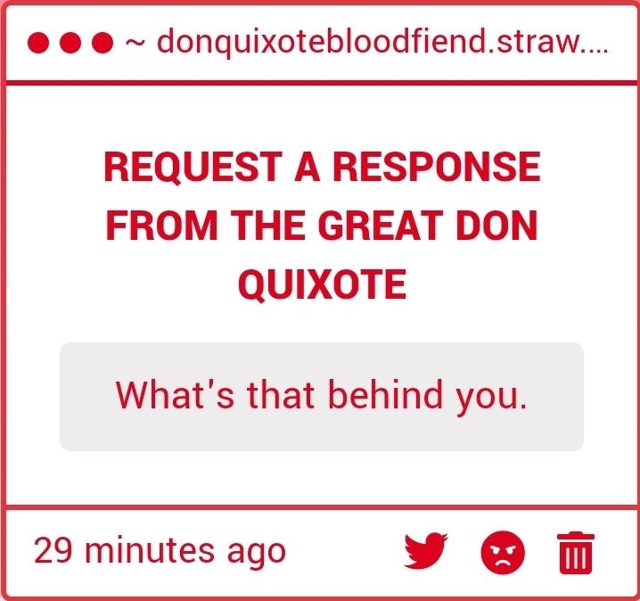 DO NOT INSULT THE GREAT DON QUIXOTE IN SUCH A MANNER AGAIN!!! WHAT EVEN IS A "BLOODFIEND"???????
