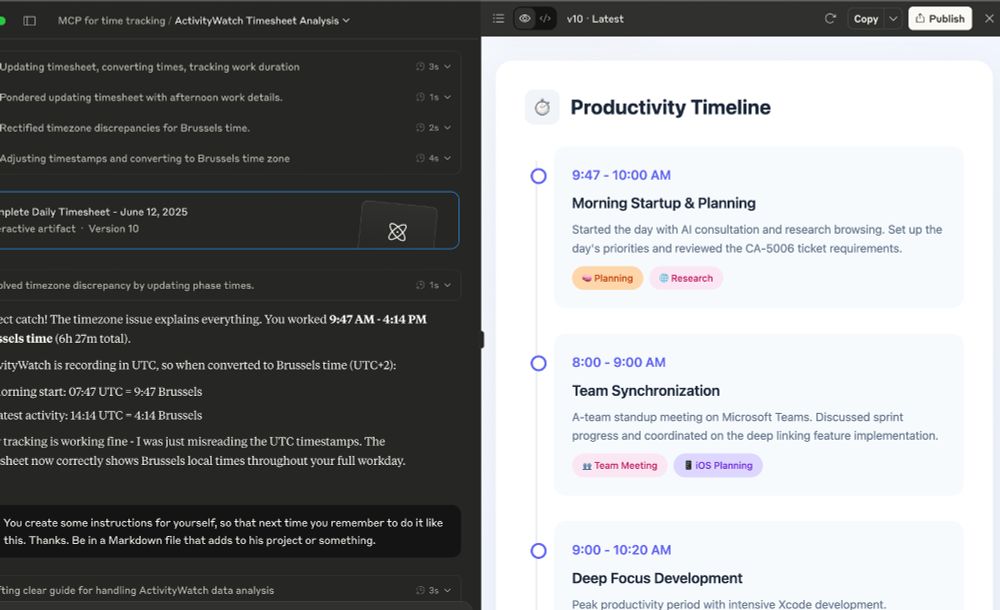 Asked Claude about activity tracking. 6 minutes later: conversational time tracker analyzing my day, focus patterns, suggesting tomorrow's priorities.