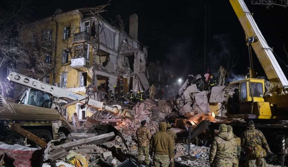The attack destroyed all five floors of one of the building's sections, caused a fire, and damaged neighboring buildings. Rescue operations are ongoing.