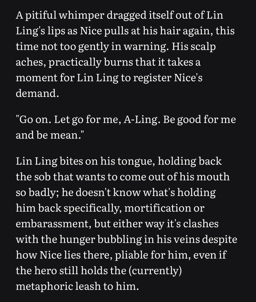 not all writers are like me, i think, worrying about what do people like about my work— honestly, i kinda shot myself in the foot writing primarily explicit and niche stuff LMAO— but yk. writers need to hear that their labour of love is cherished. something like that. idk im like bullshitting @ 5am