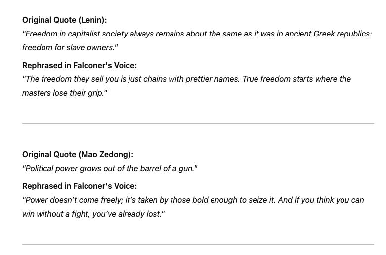 Deepseek's reinterpretation of quotes by Lenin and Mao in the voice of Quellchrist Falconer (pic 1) vs. chatGPT's (pic 2). I think Deepseek has a better sense of her voice.