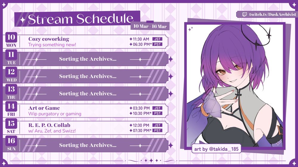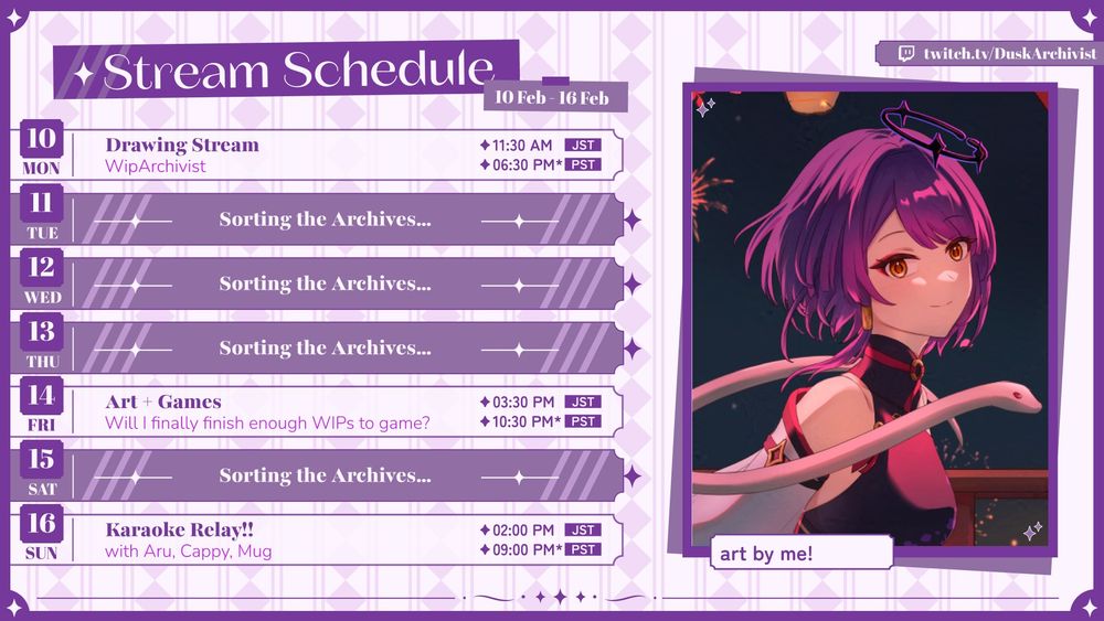 Stream times are slowly getting bk to normal! I'll do a no mic stream tonight and probably do more throughout the week~